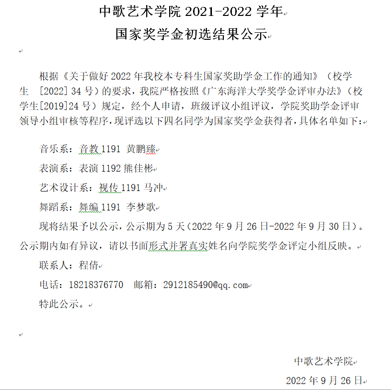 h小说网 2021-2022学年国家奖学金初选结果公示
