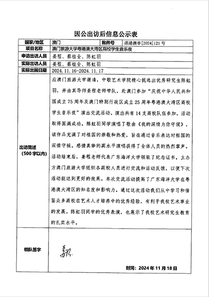 我单位姜程、蔡桂全 已于11.16-11.17 带学生陈虹羽赴 澳门 参加“粤港澳大湾区高校学生音乐夜”交流演出,现将信息公示如下,公示日期为11月18日-11月22日。
