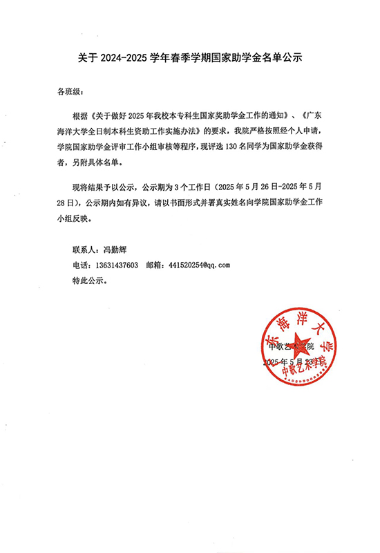 关于2024-2025学年春季学期国家助学金名单公示