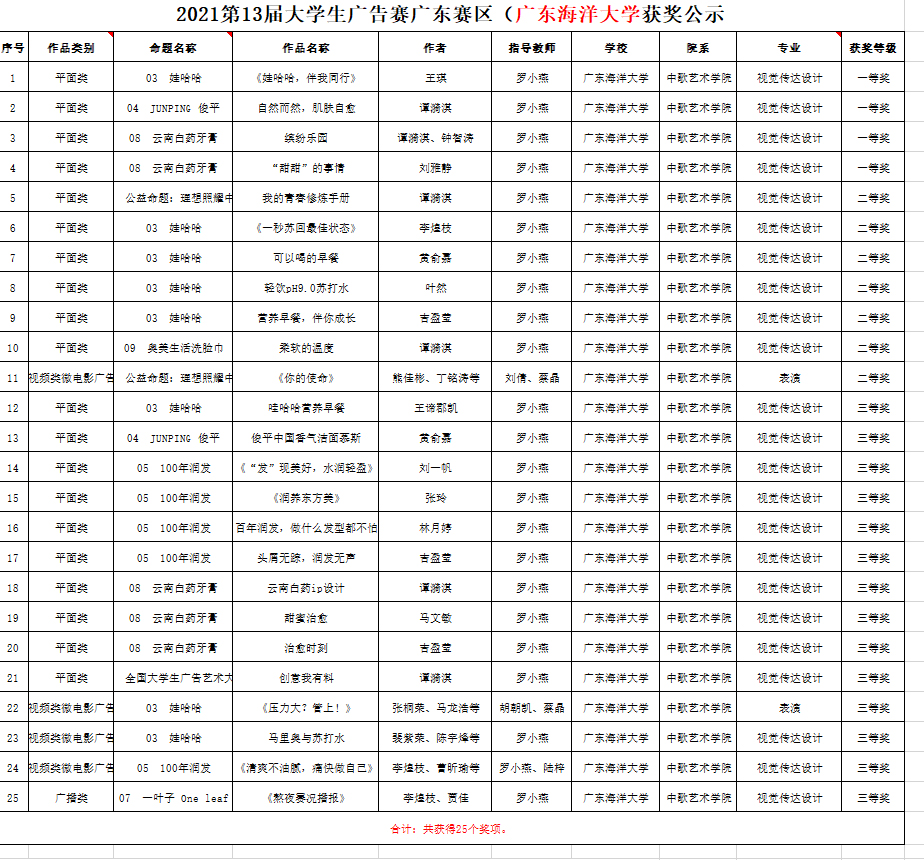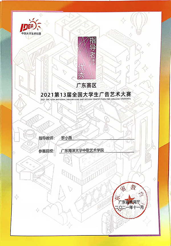 学子在由教育部高等教育司指导,中国高等教育学会、教育部高等学校新闻传播学类专业教学指导委员会共同主办的第十三届全国大学生广告艺术大赛(广东赛区)上取得优异成绩,斩获大赛25个奖项。其中一等奖4项,二等奖7项,三等奖14项,罗小燕老师获广东省教育厅颁发的“优秀指导教师”奖。