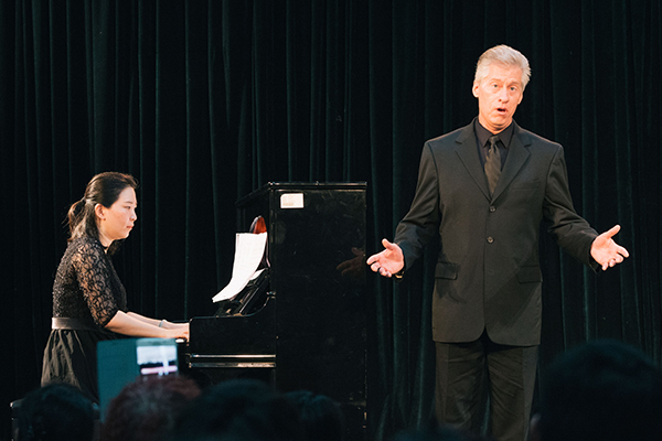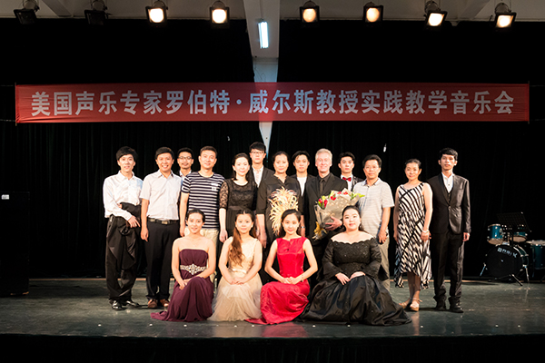 舞蹈楼206室座无虚席,现场洋溢着浓浓的学术气息。“美国声乐专家罗伯特•威尔斯教授实践教学音乐会”即将在这里举行。在座的师生早早来到现场。大家对本场音乐会充满期待。他们都想近距离欣赏教授的精彩演唱,感受大师风范。同时,很多学生也想感受和见证自己的同学跟着专家学习一周后,在演唱水平方面的变化和提高。