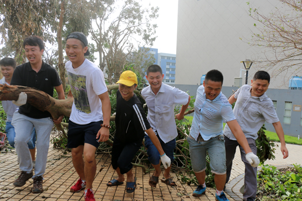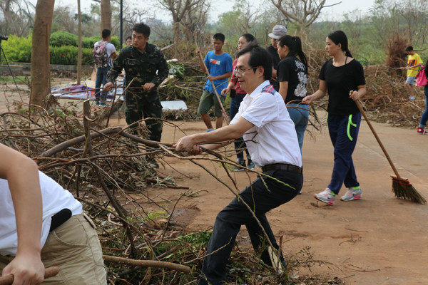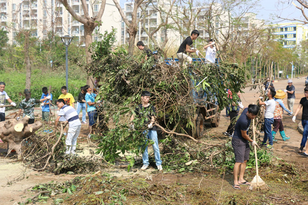 今年 10月4日,第22号强台风“彩虹”正面袭击湛江,h小说网 也遭受台风重创,损失惨重,学院周围到处满是残枝落叶以及厚厚的淤泥。风灾之后,按照学校党委的要求,在学院党委冯红爱书记的带领下,积极迅速、有序的组织全院师生员工,开展校园清理工作。在清理的过程中,全体师生员工发扬不怕苦、不怕累、众志成城的精神,挥洒汗水重建美丽校园,“彩虹”无情,中歌有爱。清理工作结束后,学院环境焕然一新,基本恢复了原来的校容校貌,同时也为全面恢复学院正常的教学秩序提供了坚强的保障。