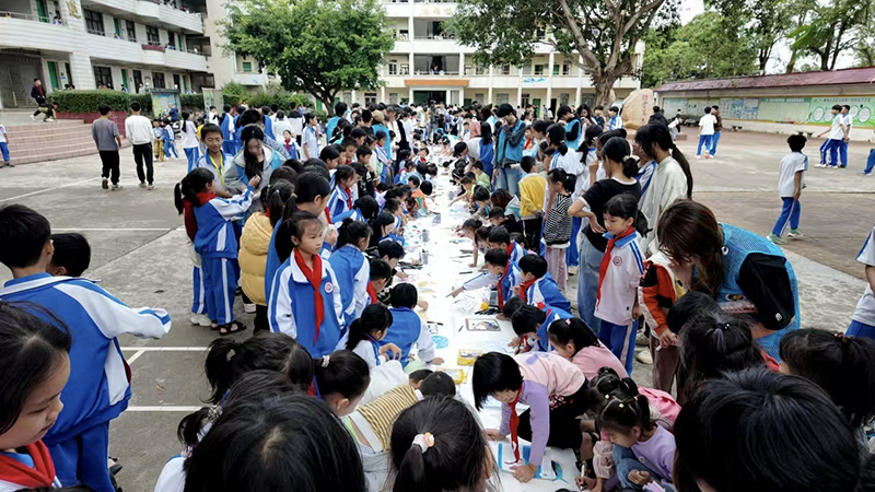 活动当天,湖光一中200余名师生们齐聚一堂,在我校美育浸润团队艺术学院老师的悉心指导下现场书写绘制40米长的书法绘画长卷,学生们用色大胆,笔触自由,把心中的蔚蓝海洋与红树林的景象通过一幅幅作品展现出他们对大自然的热爱和对美好未来的憧憬。