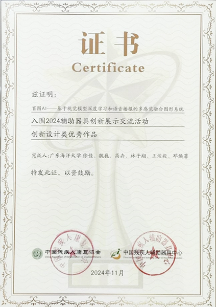 艺术设计系徐佳副教授开发的助残科技成果“盲图AI”作为创新设计类优秀作品入围本次展会辅助器具创新展示交流活动,并应邀作为优秀作品代表参加了现场颁奖仪式,徐佳参加了颁奖仪式。