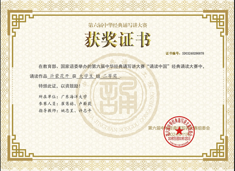 教师姚忠呈指导学生的诵读作品《沂蒙花开》脱颖而出,荣获全国大学生组二等奖。