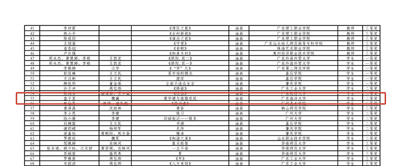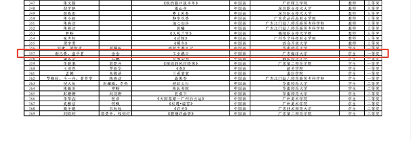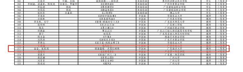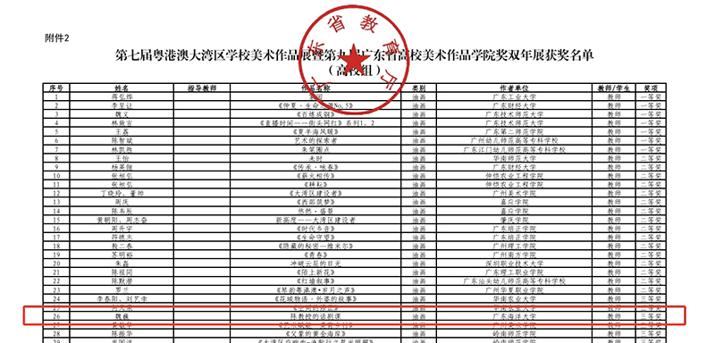 近日,由广东省教育厅主办的第七届粤港澳大湾区学校美术作品展暨第九届广东省高校美术作品学院奖双年展获奖名单正式公布。我艺术设计系师生在此次作品展中表现出色,金金老师中国画作品《绿海盛歌·共筑红树林》荣获教师组二等奖,魏巍老师油画作品《陈教授的话剧课》教师组三等奖;谢志豪、盘子茗同学中国画作品《工业港口》获学生组一等奖,盘子茗同学油画作品《黄学增与南路农民》获学生组二等奖,为学校赢得了荣誉。