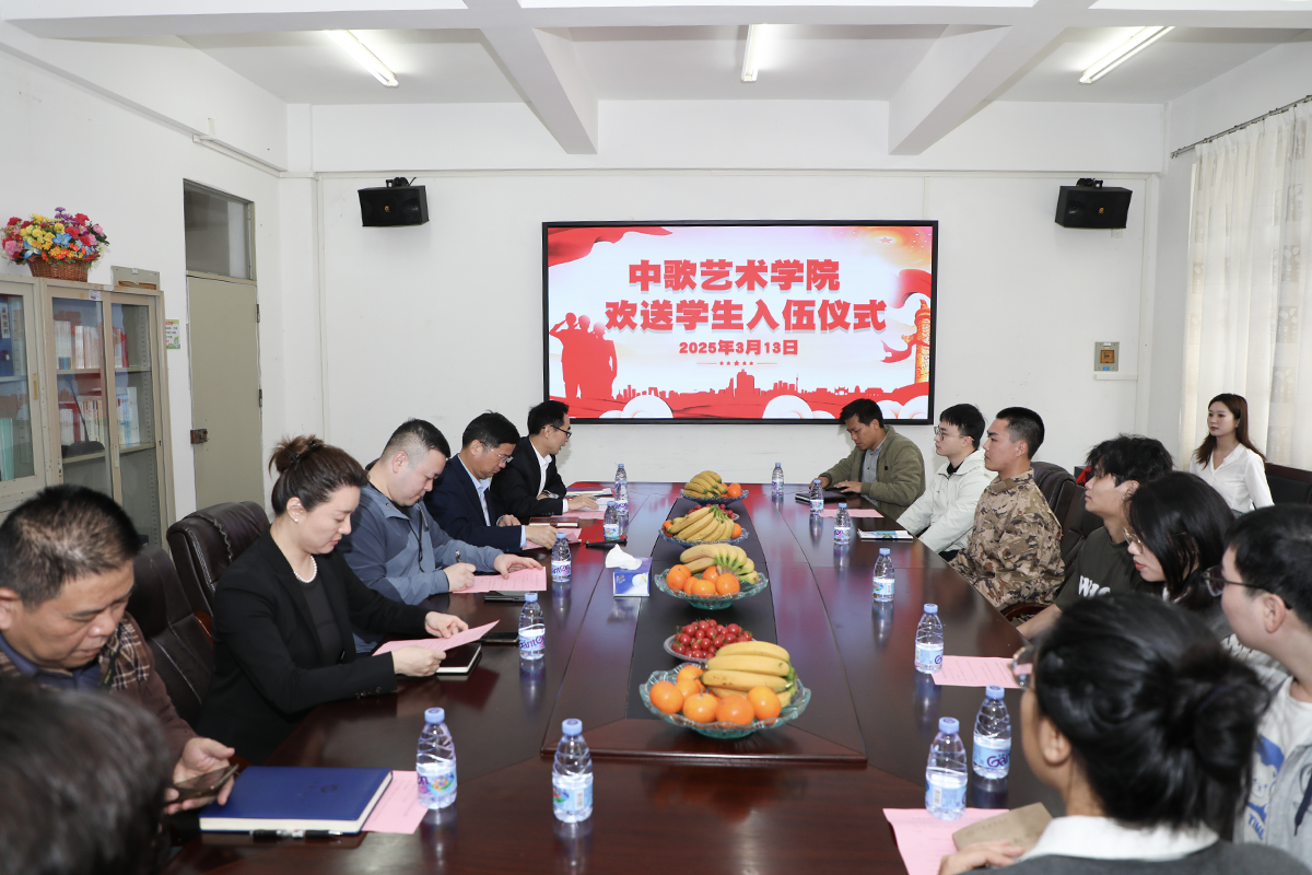 在艺海楼A208举行欢送学生入伍仪式,欢送民舞1222班尚印泉同学光荣入伍。学院党委书记欧卫军、院长李梓郡、副书记翟周、副院长刘迪以及辅导员代表、学生代表齐聚一堂,共同见证这一荣耀时刻。会议由翟周主持。