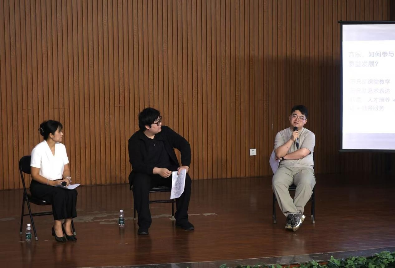 顺利举行。学院副院长何洋、音乐系负责人及相关教师、学生代表共同参与了本次活动。本次沙龙邀请作曲教师梁景泓、声乐教师韩加参与交流,由器乐教师马昱洲主持。活动围绕“音乐如何赋能高校高质量发展”这一核心议题,从人才培养、学科建设及社会服务三个层面展开深入探讨。
