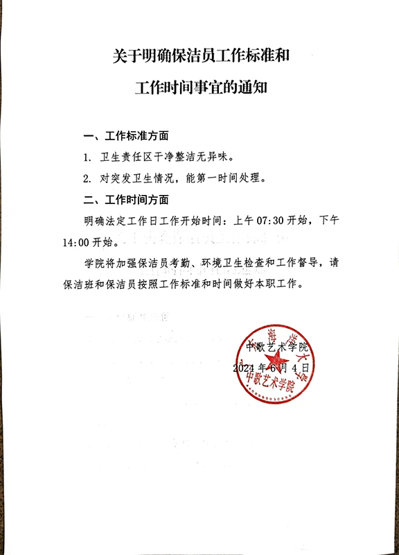 关于明确保洁员工作标准和工作时间事宜的通知